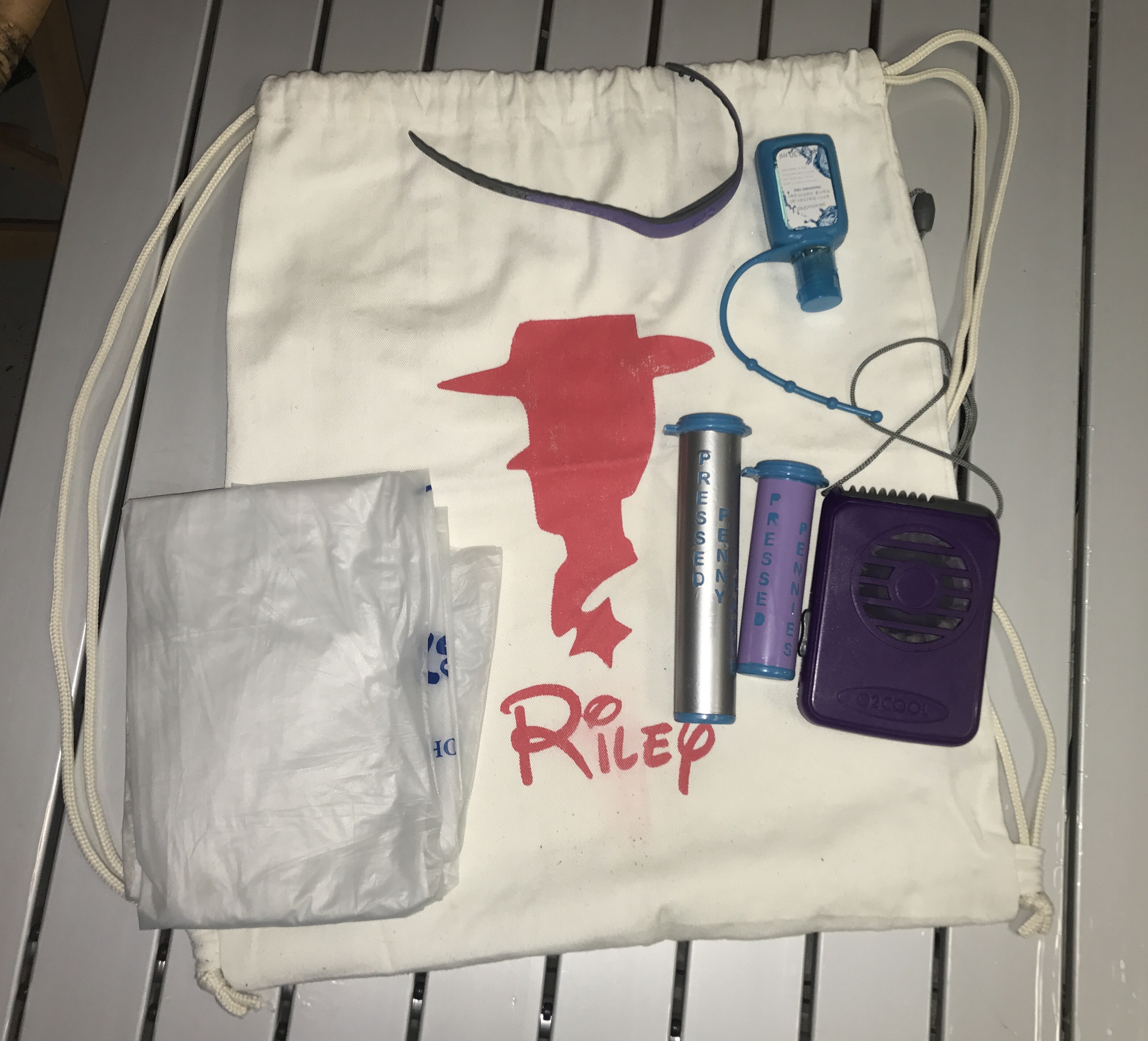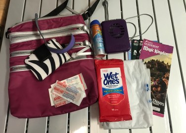 We always take bags. One, I keep my phone, maps, schedule (yes, I am THAT Disney person!), wet wipes, small wallet with cash and gift cards and a portable phone charger. A portable charger is a great investment. You will have your phone out a lot taking pictures/videos or checking the Disney World app with your fast passes, reservations and maps so batteries tend to die much quicker than usual. The kids “carry” drawstring backpacks with their autograph books, pressed penny change tubes, ponchos (you never know when you will need it in Florida), snacks, and small wearable fans if we travel in summer.